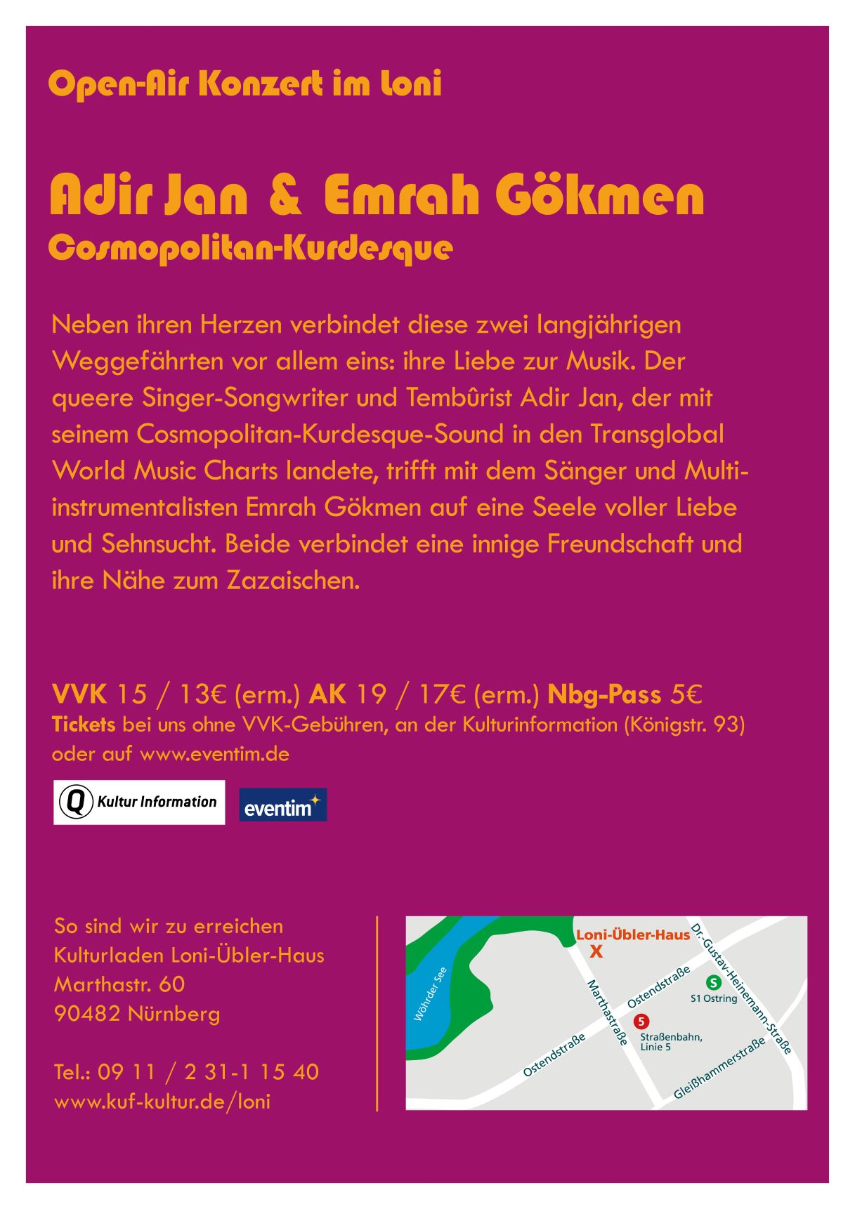Im Anhang findet ihr den Flyer und hier den facebooklink: Open Air – Adir Jan & Emrah Gökmen – Cosmopolitan-Kurdesque-Sound | Facebook